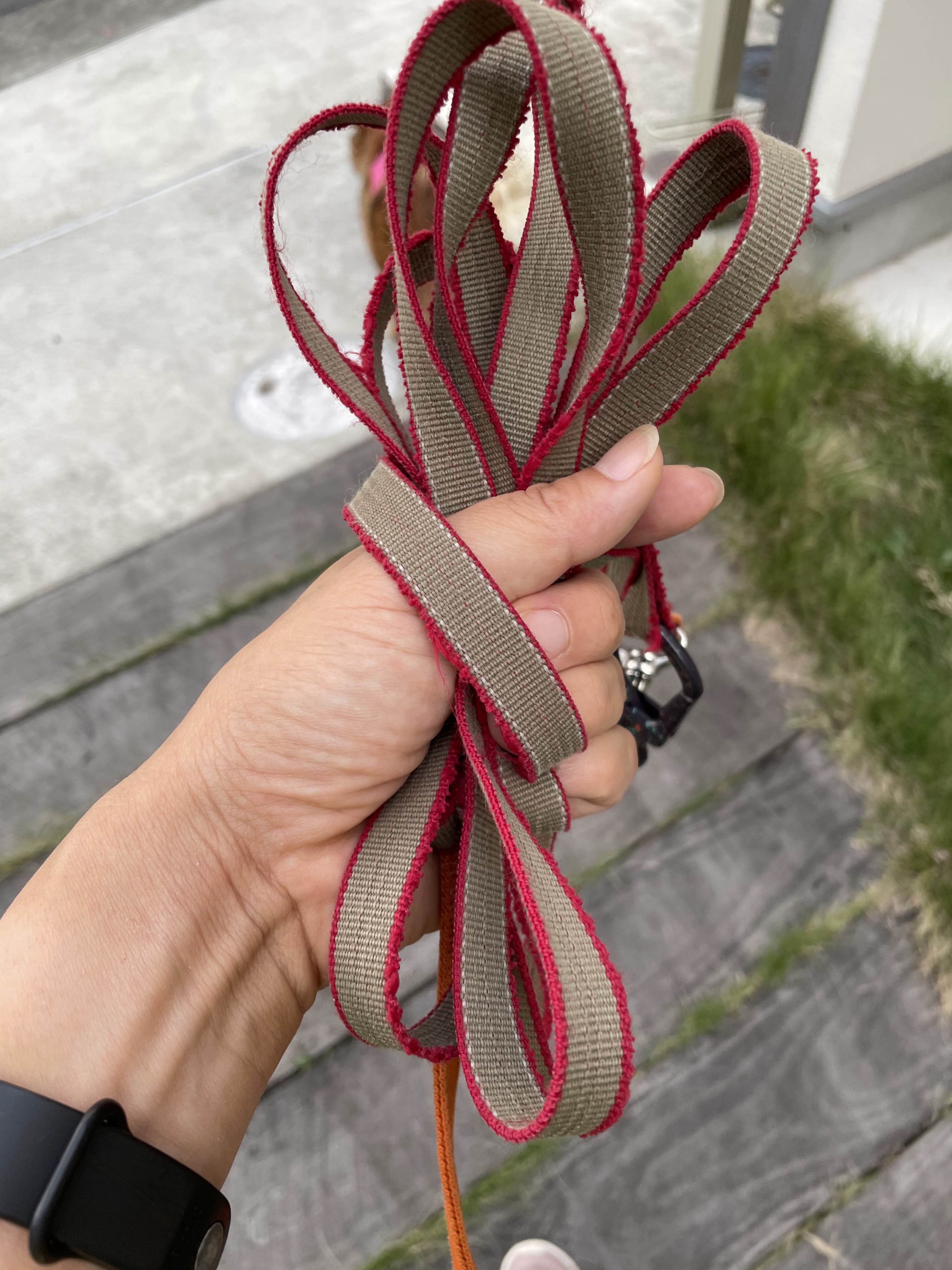 ➡ 街中のお散歩では横ピタが必要かも知れませんが、人のいない道では、愛犬主導で自由に道を選び、クン活させてあげたいという思いから、私は日常的に5mのリードをこんな感じで握り込み、長さを自由に調節して使っています。(20cmくらいの長さで折り返し、最後は親指に巻き付けてストッパーとする。)