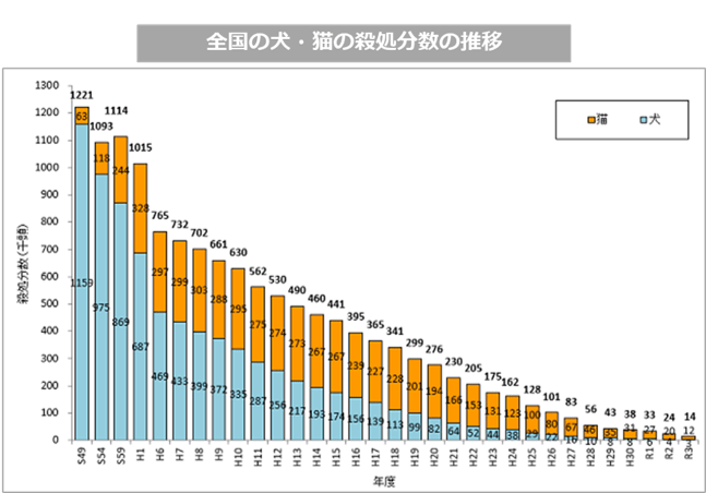 この数字だけを見ると、大幅に減少したように見えますが、それでも8~9頭に1頭は殺処分されていることが分かります😢。(処分、、、って、そもそもひどい言葉です)