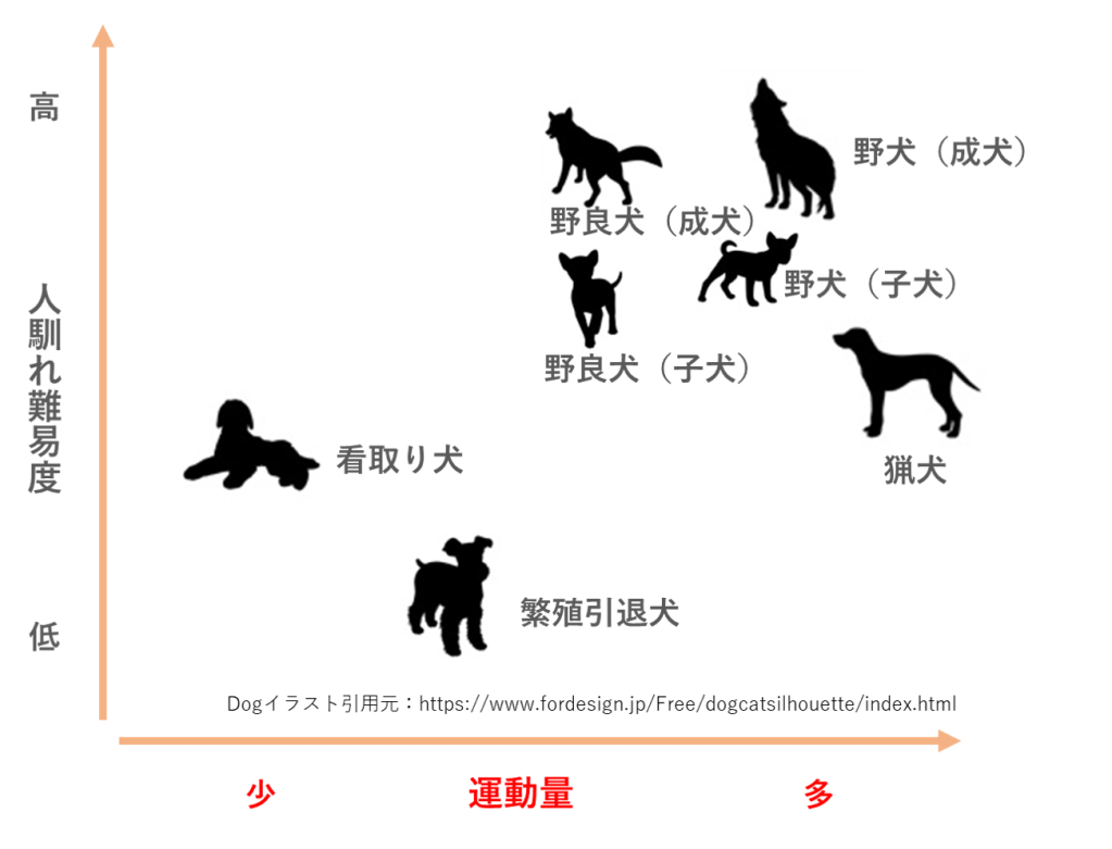 それぞれの出自によって人との共生のしやすさもまったく異なります。野犬を迎えた身として個人的印象ですが、共生のしやすさは、「人馴れのしやすさ」と「運動量」の2つがとても大きいと感じています。この2軸で、主観でざっくりとしたマトリックスを書いてみました。